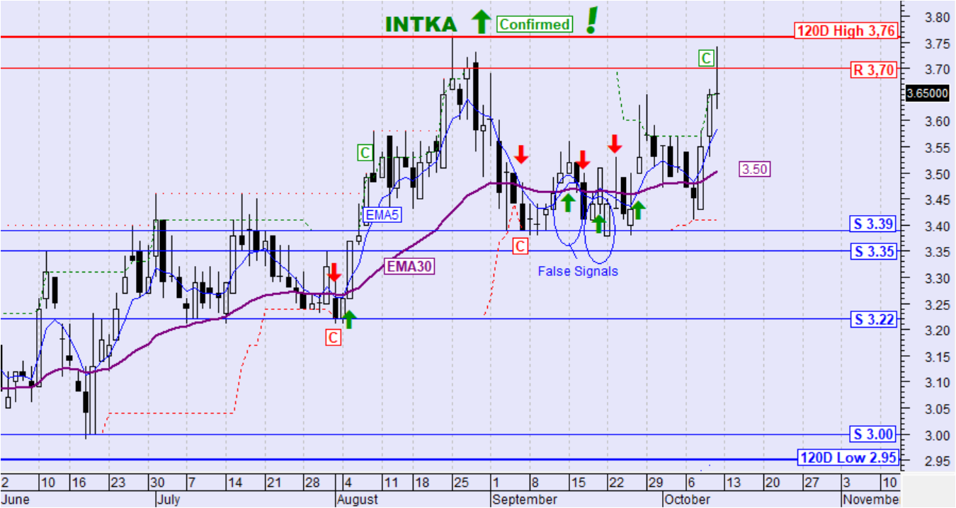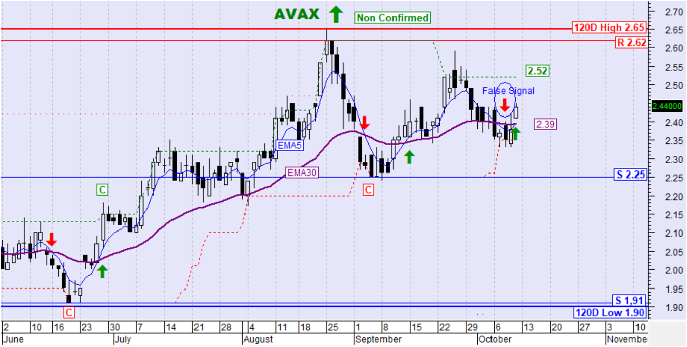 Η μετοχή την περασμένη εβδομάδα αρχικά κινήθηκε καθοδικά με τον ΕΜΑ5 να περνάει χαμηλότερα από τον ΕΜΑ30 που είχε ως αποτέλεσμα τη σηματοδότηση αντιστροφής της μεσοπρόθεσμης τάσης σε καθοδική. Η σηματοδότηση αποδείχθηκε ψευδής αφού άμεσα η τιμή γύρισε ανοδικά και ο ΕΜΑ5 πέτυχε την υπέρβαση του ΕΜΑ30 με αποτέλεσμα την ακύρωση της προηγούμενης καθοδικής σηματοδότησης.