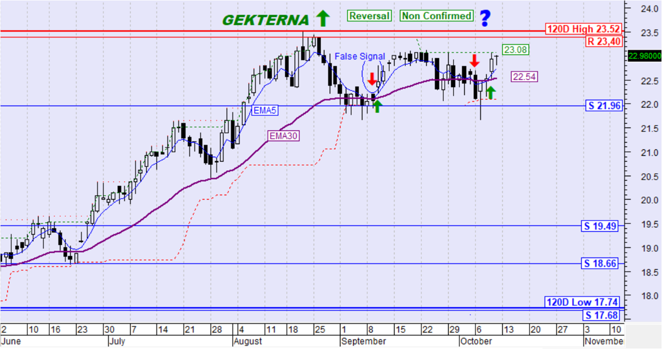 Το ημερήσιο όριο επιβεβαίωσης της αντιστροφής της τάσης σε ανοδική βρίσκεται στα 23,08€