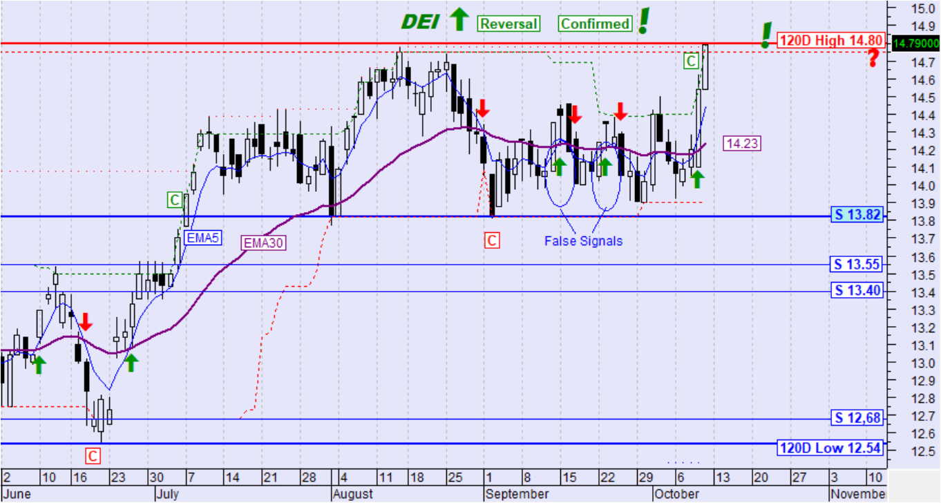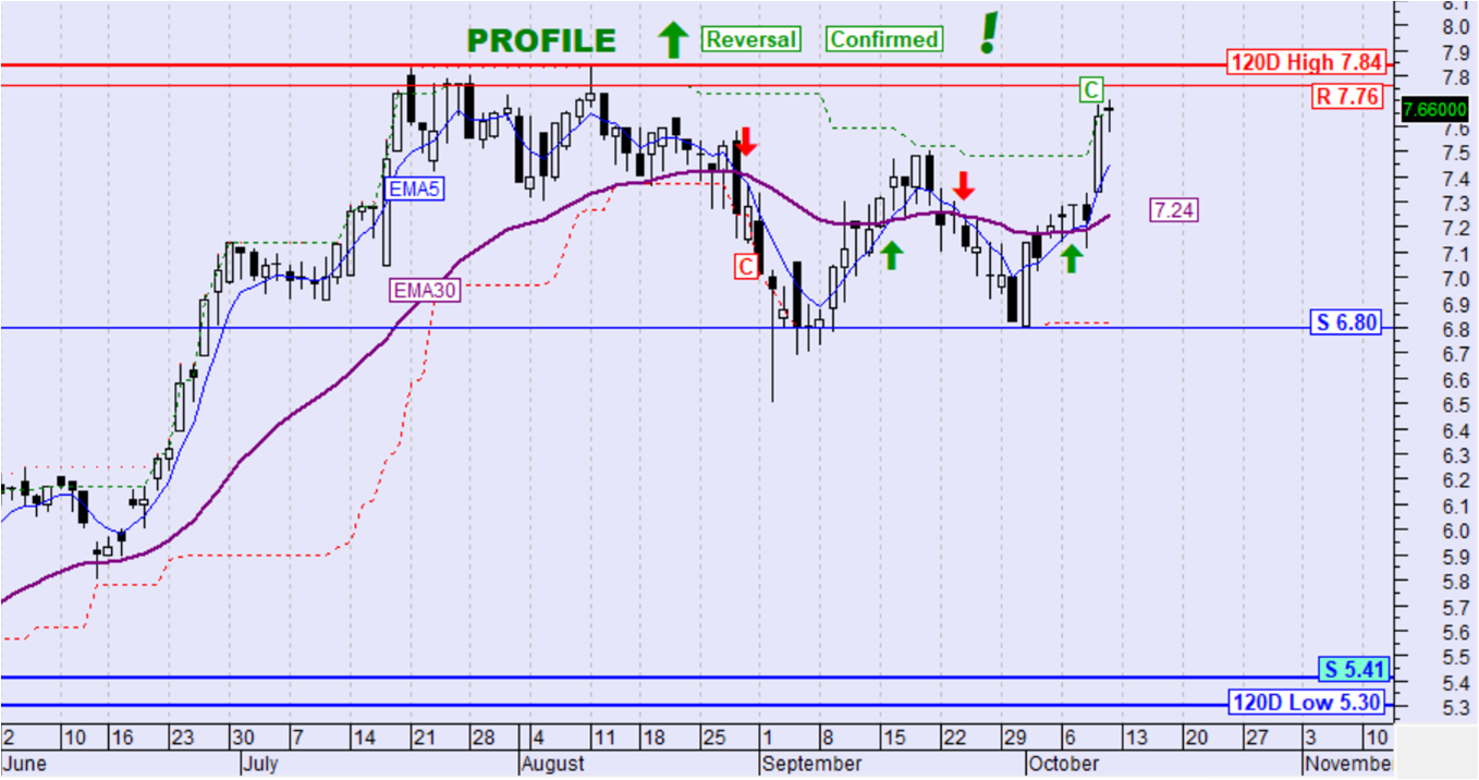 Η μετοχή την περασμένη εβδομάδα κινήθηκε ανοδικά, πέτυχε την υπέρβαση του ΕΜΑ30 και στη συνέχεια πέτυχε νέο υψηλό 120 ημερών. Ο ΕΜΑ5 πέρασε ψηλότερα του ΕΜΑ30 με αποτέλεσμα τη σηματοδότηση αντιστροφής της μεσοπρόθεσμης τάσης σε ανοδική η οποία ταυτόχρονα επιβεβαιώθηκε με υπέρβαση του ορίου επιβεβαίωσης της αντιστροφής της τάσης σε ανοδική.
