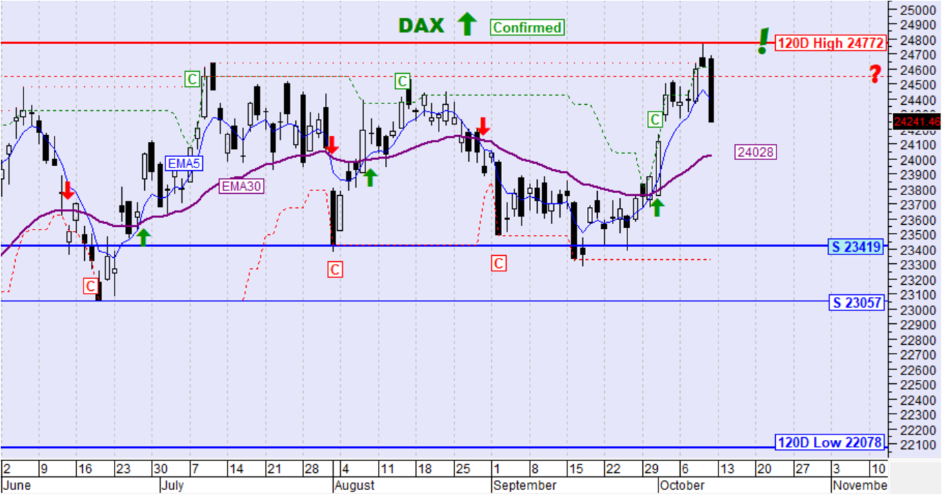 Ο Γερμανικός δείκτης την περασμένη εβδομάδα αρχικά κινήθηκε ανοδικά και πέτυχε νέο υψηλό 120 ημερών. Στη συνέχεια πέρασε σε μια έντονη διόρθωση χωρίς ακόμη σηματοδότηση. Ο ΕΜΑ5 διατηρεί την τιμή του ψηλότερα από τον ΕΜΑ30 και έτσι διατηρείται η μεσοπρόθεσμη ανοδική τάση.