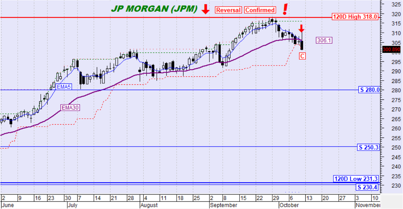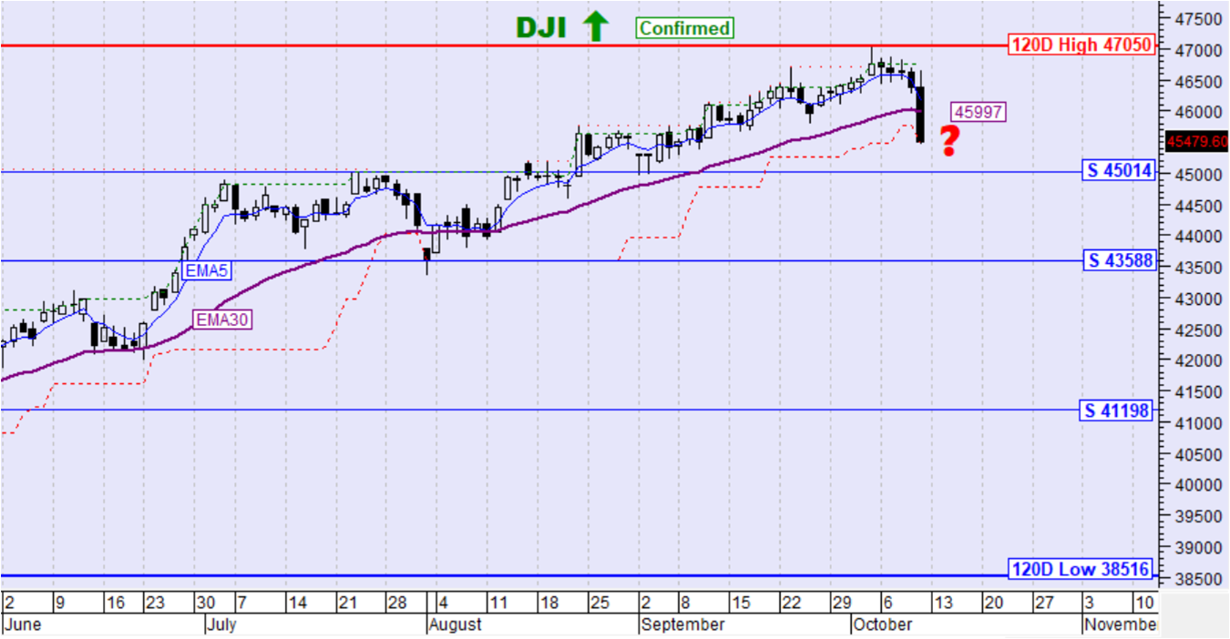 Ο αμερικανικός δείκτης DJI την περασμένη εβδομάδα κινήθηκε έντονα διορθωτικά και πέτυχε την καθοδική διάσπαση του ΕΜΑ30 χωρίς προς το παρόν κάποια άλλη σηματοδότηση. Ο ΕΜΑ5 διατηρεί ακόμη την τιμή του οριακά ψηλότερα από τον ΕΜΑ30 και έτσι διατηρείται η μεσοπρόθεσμη ανοδική τάση.