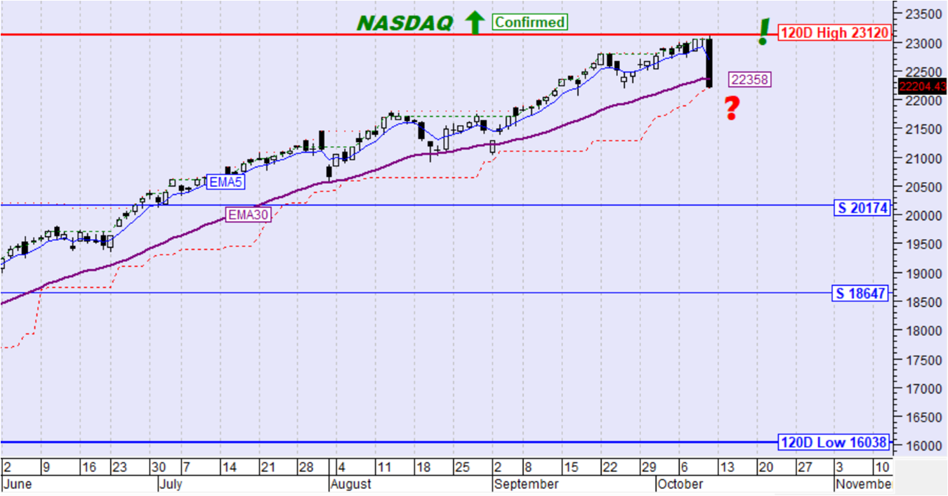 Ο δείκτης NASDAQ την περασμένη εβδομάδα κινήθηκε έντονα διορθωτικά αλλά στο υψηλό της εβδομάδας πέτυχε νέο υψηλό 120 ημερών. Έκλεισε την εβδομάδα επιτυγχάνοντας την καθοδική διάσπαση του ΕΜΑ30 χωρίς προς το παρόν κάποια άλλη σηματοδότηση. Ο ΕΜΑ5 διατηρεί ακόμη την τιμή του ψηλότερα από τον ΕΜΑ30 και έτσι διατηρείται η μεσοπρόθεσμη ανοδική τάση.