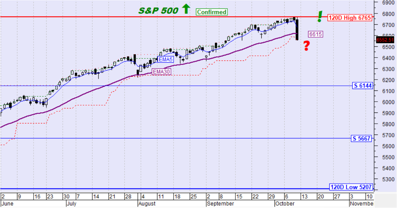 Ο δείκτης S&P500 την περασμένη εβδομάδα κινήθηκε έντονα διορθωτικά αλλά στο υψηλό της εβδομάδας πέτυχε νέο υψηλό 120 ημερών. Έκλεισε την εβδομάδα επιτυγχάνοντας την καθοδική διάσπαση του ΕΜΑ30 χωρίς προς το παρόν κάποια άλλη σηματοδότηση. Ο ΕΜΑ5 διατηρεί ακόμη την τιμή του ψηλότερα από τον ΕΜΑ30 και έτσι διατηρείται η μεσοπρόθεσμη ανοδική τάση.