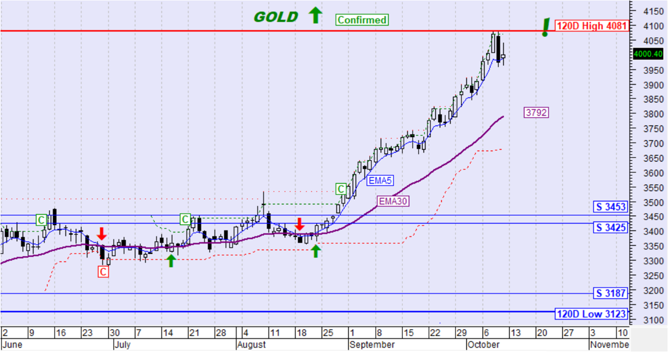 Η τιμή του χρυσού την περασμένη εβδομάδα κινήθηκε ανοδικά και πέτυχε νέο υψηλό 120 ημερών υπερβαίνοντας για πρώτη φορά τα 4000$. Ο ΕΜΑ5 διατηρεί την τιμή του ψηλότερα από τον ΕΜΑ30 και έτσι διατηρείται η μεσοπρόθεσμη ανοδική τάση.