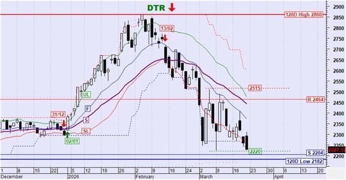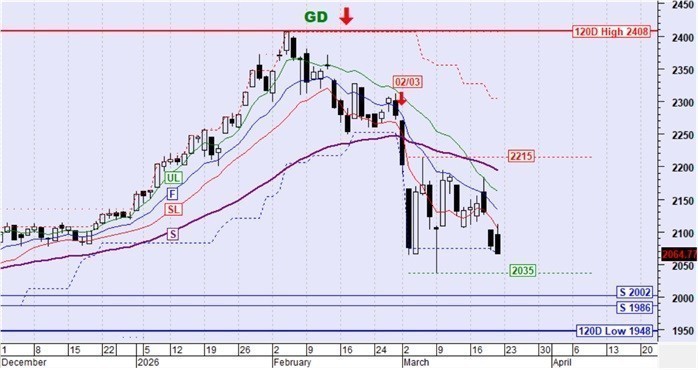 Ο ΓΔ συνέχισε καθοδικά προς το κάτω όριο της περιοχής συσσώρευσης μεταξύ 2035 και 2215 μονάδων όπως ήταν αναμενόμενο. Το ενδιαφέρον στοιχείο για την ερχόμενη εβδομάδα θα είναι η συμπεριφορά του δείκτη στην προσέγγιση/επαφή της τιμής με το κάτω όριο. Αν διασπαστεί καθοδικά τότε θα δοκιμαστεί το ζεύγος στηρίξεων στις 1986-2002 μονάδες αν και είναι αρκετά πιθανό να μην συμβεί αυτό αλλά να προκληθεί μια μικρή ή μεγαλύτερη ανοδική αντίδραση από αυτή την προσέγγιση/επαφή.