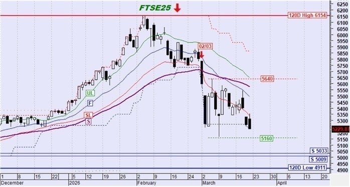 Ο FTSE25 συνέχισε καθοδικά προς το κάτω όριο της περιοχής συσσώρευσης μεταξύ 5160 και 5640 μονάδων όπως ήταν αναμενόμενο. Το ενδιαφέρον στοιχείο για την ερχόμενη εβδομάδα θα είναι η συμπεριφορά του δείκτη στην προσέγγιση/επαφή της τιμής με το κάτω όριο. Αν διασπαστεί καθοδικά τότε θα δοκιμαστεί το ζεύγος στηρίξεων στις 5009-5033 μονάδες αν και είναι αρκετά πιθανό να μην συμβεί αυτό αλλά να προκληθεί μια μικρή ή μεγαλύτερη ανοδική αντίδραση από αυτή την προσέγγιση/επαφή.