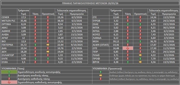 Η τάση και προοπτική των μετοχών του καλαθιού παρακολούθησης (διαμόρφωση με το κλείσιμο της Παρασκευής 20/03) είναι όπως στον παρακάτω πίνακα
