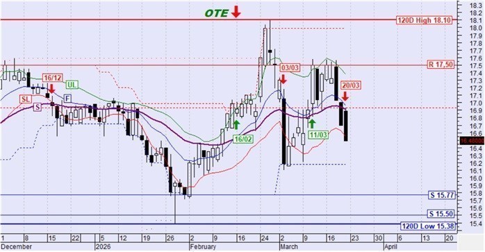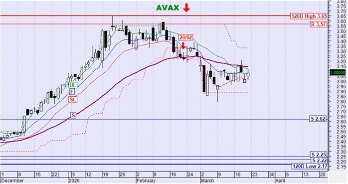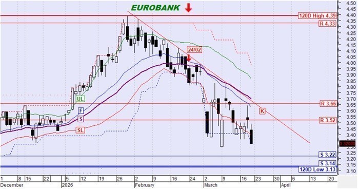 Η μετοχή γύρισε έντονα καθοδικά εξακολουθεί να βρίσκεται κάτω από την ασφυκτική πίεση του αργού κινητού μέσου όρου S και της κατερχόμενης γραμμής τάσης Κ ενώ πλέον έχουν ενεργοποιηθεί ως αντιστάσεις και τα επίπεδα των 3,66€ και 3,52€. Το ενδιαφέρον μετατίθεται στις στηρίξεις στα 3,22€ και 3,14€ και στο κατά πόσο αυτές θα φανούν ισχυρές ώστε να σταματήσουν την καθοδική πορεία της μετοχής.