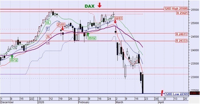 Ο DAX κινήθηκε έντονα καθοδικά και διατηρεί την καθοδική τάση. Διέσπασε τις στηρίξεις στις οποίες είχε βρει ισορροπία και πέτυχε νέο χαμηλό 120 ημερών.