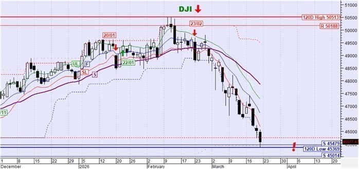 Ο DJI κινήθηκε καθοδικά και διατηρεί την καθοδική τάση. Έφτασε όπως ήταν αναμενόμενο στην περιοχή των 46000 μονάδων όπου και πέτυχε νέο χαμηλό 120 ημερών. Συνάντησε την παλιά στήριξη στις 45479 μονάδες όπου είναι πιθανό να αναζητήσει ισορροπία χωρίς όμως να υπάρχει κάποια σχετική ένδειξη αυτή τη στιγμή.