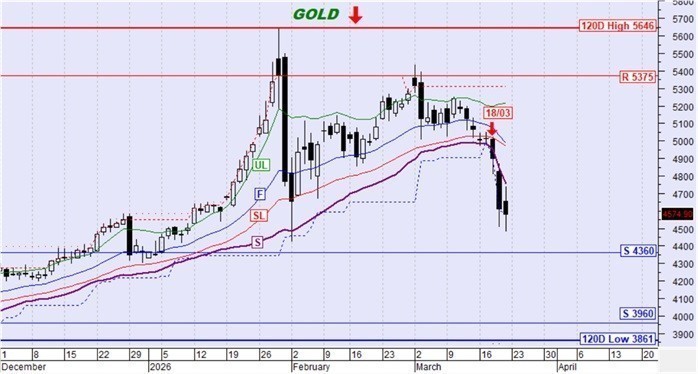 Ο χρυσός μετά από πολλούς μήνες σηματοδότησε την περασμένη εβδομάδα την αντιστροφή της τάσης σε καθοδική. Σημαντική για τη συνέχεια είναι η στήριξη στα 4360$ καθώς είναι αρκετά πιθανό να τερματιστεί η καθοδική κίνηση σε αυτό το επίπεδο τιμής. Σε περίπτωση καθοδικής διάσπασης είναι πιθανό να δοκιμαστεί και το χαμηλό των 120 ημερών.