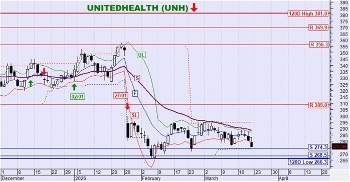 Η μετοχή κινήθηκε καθοδικά και διατηρεί την καθοδική τάση. Είναι εμφανής η στήριξη στο επίπεδο των 274,3$ με την εκδήλωση ανοδικών αντιδράσεων κάθε φορά που την προσεγγίζει η τιμή της μετοχής. Αν χαθεί αυτή η στήριξη θα δοκιμαστεί το χαμηλό 120 ημερών.
