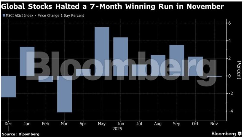 Σημειώνεται ότι ο δείκτης MSCI All Country World υποχώρησε κατά 0,1% τον Νοέμβριο, μετά από επτά συνεχόμενους μήνες ανόδου.