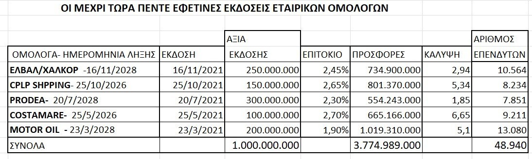 Από τις πέντε εφετινές εταιρικές εκδόσεις ( της Motor Oil, τα ναυτιλιακά της Costamare του Κωστή Κωνσταντακόπουλου και της CPLP Shipping του ομίλου Μαρινάκη, κι εκείνα των Prodea και ΕΛΒΑΛΧΑΛΚΟΡ) έχουν αντληθεί κεφάλαια 1 δισ. ευρώ.