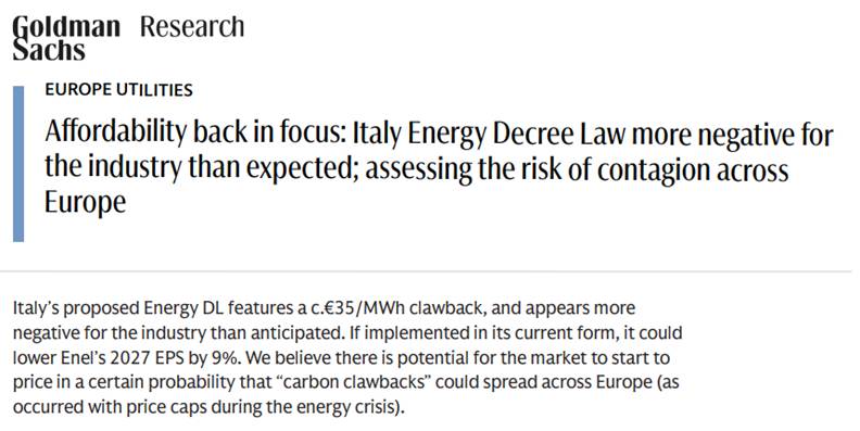 Για να καταλάβετε, η Goldman Sachs μας λέει εάν ακολουθηθεί το μοντέλο της Ιταλίας στις άλλες ευρωπαϊκές χώρες, βλέπει τότε τα κέρδη των εταιρειών παραγωγής ενέργειας να καταποντίζονται.
