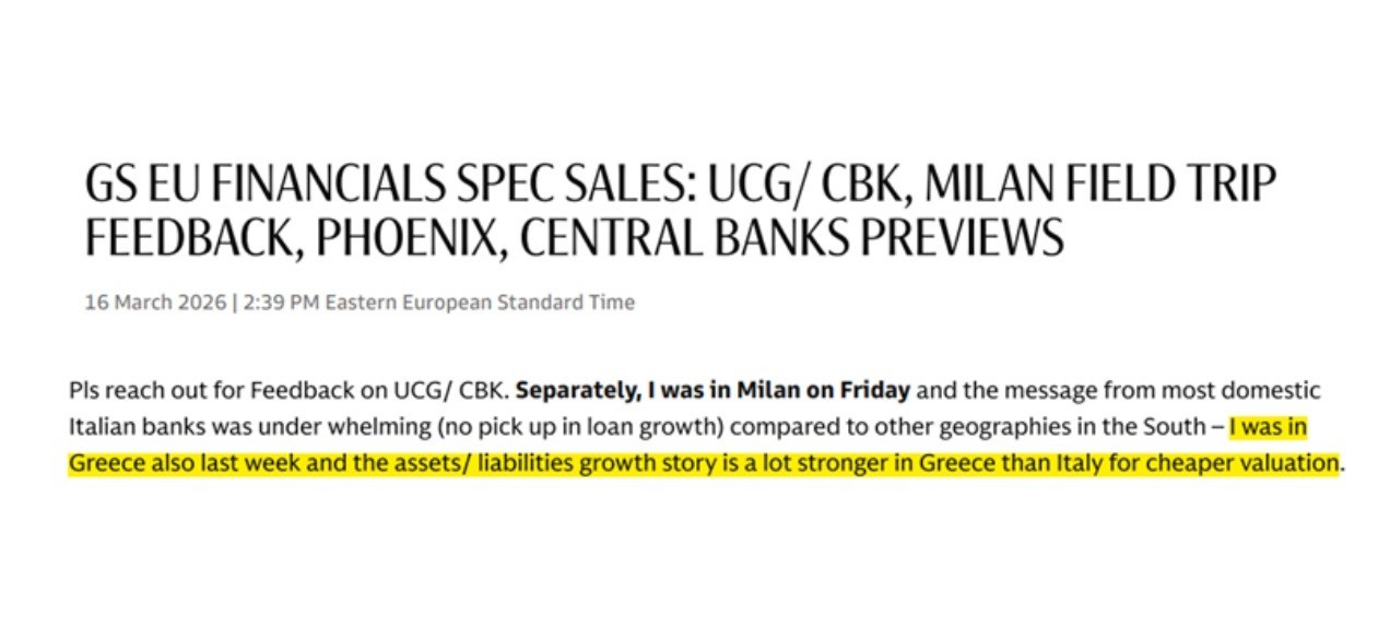 Σήμερα σας αποκαλύπτουμε ότι η Goldman Sachs, μετά το road show που είχε στην Ελλάδα, πήγε στην Ιταλία και στην Ισπανία να δει τις εκεί τράπεζες.