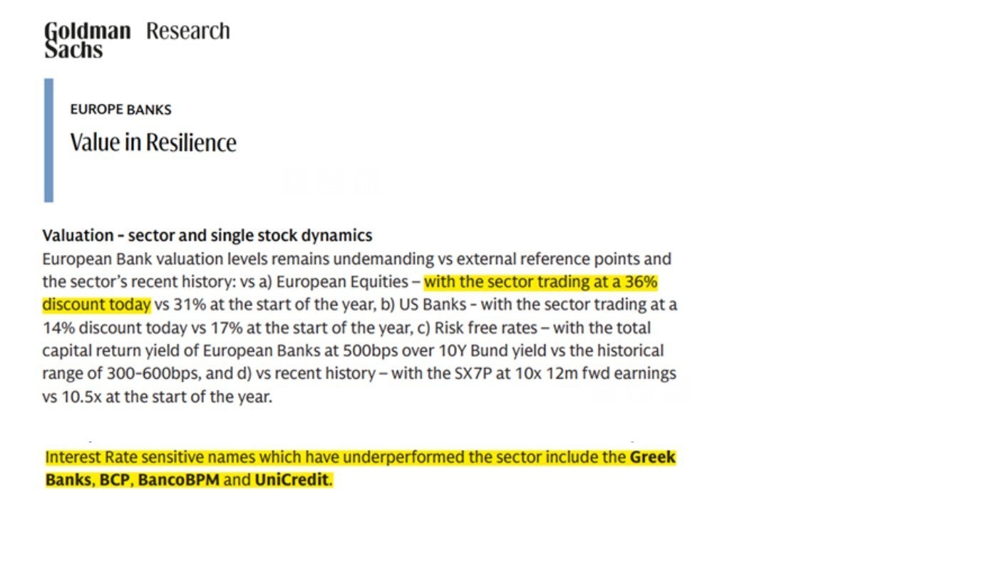 Για να γνωρίζετε, σύμφωνα με το τελευταίο report της Goldman Sachs, οι ευρωπαϊκές τράπεζες παίζουν με ένα P/E = 9,8 με τις αμερικάνικες στο 11,4 και με τις ευρωπαϊκές μετοχές να παίζουν με ένα P/E = 15,2.