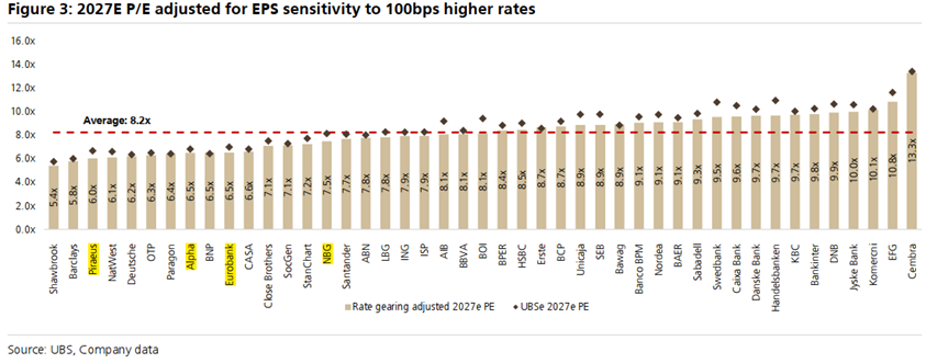 Η UBS βλέπει τα κέρδη/μετοχή της Πειραιώς να αυξάνονται κατά 11%, της Εθνικής κατά 9%, της Eurobank κατά 7% και της Alpha Bank κατά 5%.