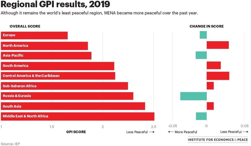 Το Αφγανιστάν είναι ο λιγότερο ειρηνικός τόπος στον κόσμο, αντικαθιστώντας τη Συρία, με το Νότιο Σουδάν, το Ιράκ και την Υεμένη να ολοκληρώνουν την τελευταία πεντάδα.