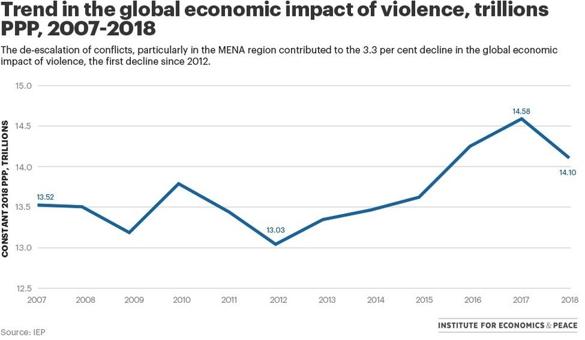 Η βία δεν έχει μόνο ανθρώπινο κόστος – υπάρχει και οικονομικό. Ο αντίκτυπός της στην παγκόσμια οικονομία πέρυσι ήταν 14,1 τρισεκατομμύρια δολάρια σε όρους ισοτιμίας αγοραστικής δύναμης. Αυτό μεταφράζεται σε 1.853 δολάρια ανά άτομο. Έπεσε όμως, για πρώτη φορά από το 2012.