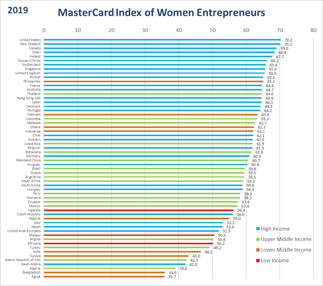 Η γεωγραφία του φύλου είναι δύσκολη και περίπλοκη. Ο τελευταίος δείκτης γυναικών επιχειρηματιών της Mastercard (MIWE), για παράδειγμα, υπογραμμίζει τη σημασία της γεωγραφίας στην γυναικεία επιχειρηματικότητα. Δεν είναι έκπληξη το γεγονός ότι ο MIWE έδειξε πως οι προηγμένες οικονομίες με υψηλότερα εισοδήματα, με ανοικτές και ζωντανές αγορές που υποστηρίζουν τις μικρομεσαίες επιχειρήσεις και την ευκολία επιχειρηματικής δραστηριότητας, παρέχουν εξαιρετικά ευνοϊκές και πρόσφορες συνθήκες για την υποστήριξη των γυναικών επιχειρηματιών.