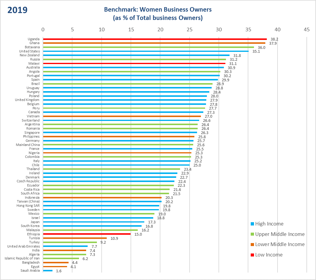 Πιο αναπάντεχα, ο MIWE αποκάλυψε επίσης ότι υπάρχουν μερικές λιγότερο πλούσιες, αναπτυσσόμενες οικονομίες που ξεπερνούν τους πιο ανεπτυγμένους ομολόγους τους. Όσον αφορά στις γυναίκες ιδιοκτήτριες επιχειρήσεων ως ποσοστό όλων των επιχειρήσεων, η Ουγκάντα, η Γκάνα και η Μποτσουάνα έχουν το υψηλότερο ποσοστό γυναικείας ιδιοκτησίας σε όλο τον κόσμο – οι γυναίκες αντιπροσωπεύουν το 38,2%, 37,9% και 36% αντίστοιχα.