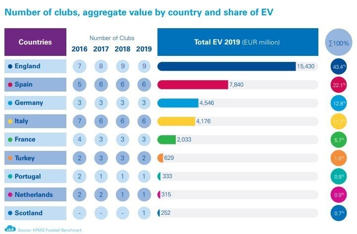 Η αγγλική Premier League συνεχίζει να κυριαρχεί στις οικονομικές επιδόσεις του ευρωπαϊκού ποδοσφαίρου, με εννέα συλλόγους στον κατάλογο της KPMG, που αντιπροσωπεύουν τα τέσσερα πέμπτα της συνολικής αξίας.