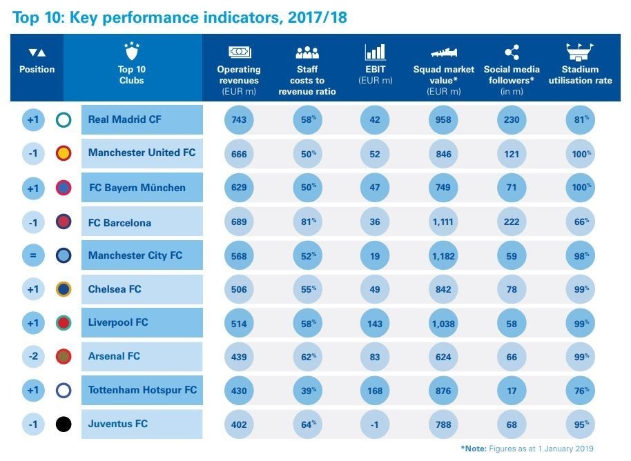 Η έκθεση κατατάσσει τους 32 μεγαλύτερους συλλόγους της Ευρώπης με βάση την επιχειρησιακή αξία (EV), ένα ποσό που υπολογίζεται με βάση την κερδοφορία, τη δημοτικότητα, το αθλητικό δυναμικό, τα τηλεοπτικά δικαιώματα και την αξία του γηπέδου τους.