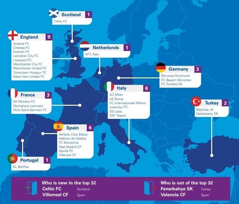 Στις 32 κορυφαίες φέτος μπήκε η Σέλτικ, η πρώτη σκωτσέζικη ομάδα που εντάσσεται στην έρευνα από τότε που η KPMG ξεκίνησε την έκθεση το 2016, και η ισπανική Βιγιαρεάλ. Ωστόσο, η ισπανική Βαλένθια και η τουρκική Φενέρμπαχτσε έμειναν εκτός του φετινού καταλόγου.