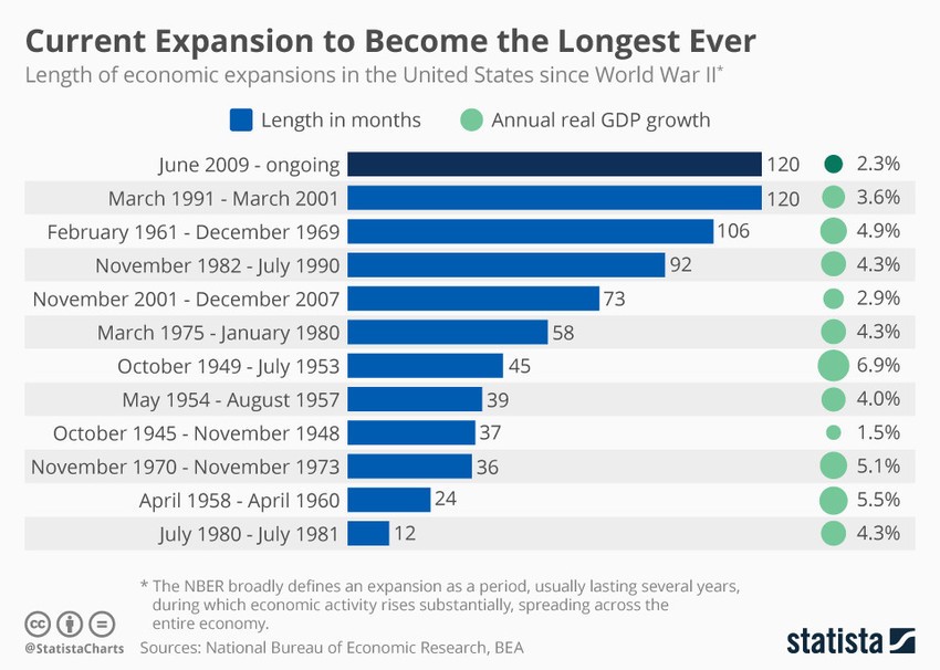 Όπως δείχνει το διάγραμμα που ακολουθεί, η τρέχουσα επέκταση είναι ήδη στην κορυφή, συγκρινόμενη μόνο με την επέκταση που διήρκεσε από τον Μάρτιο του 1991 έως τον Μάρτιο του 2001 και κορυφώθηκε με την έκρηξη της φούσκας dot-com. Αν και μπορεί να είναι σύντομα η μεγαλύτερη, η τρέχουσα επέκταση σίγουρα δεν είναι η ισχυρότερη στην ιστορία. Με μέση ετήσια αύξηση του ΑΕΠ κατά 2,3%, η συνεχιζόμενη ανάκαμψη είναι στην πραγματικότητα η δεύτερη πιο αργή από το τέλος του Β’ Παγκοσμίου Πολέμου.