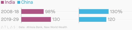 Αυτό θα σήμαινε ότι η Ινδία θα ξεπεράσει την Κίνα ως η χώρα με την ταχύτερη συγκέντρωση πλούτου στον κόσμο και ότι μέχρι το 2028 ο αθροιστικός ιδιωτικός πλούτος των Ινδών θα είναι υπερδιπλάσιος σε σχέση με την Αυστραλία, τη Γερμανία ή το Ηνωμένο Βασίλειο.