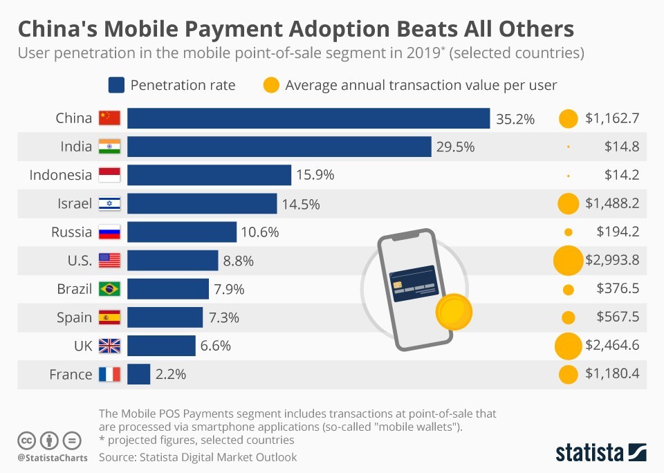 Ωστόσο, η συνολική ετήσια συναλλακτική αξία ανά πελάτη είναι υψηλότερη στις ΗΠΑ, το Ηνωμένο Βασίλειο και τη Γαλλία από ό,τι στην Κίνα. Ο μέσος Κινέζος καταναλωτής αναμένεται να δαπανήσει περίπου 1.100 δολάρια με εφαρμογές πληρωμής το 2019, σε σύγκριση με περισσότερα από 2.400 δολάρια στο Ηνωμένο Βασίλειο και σχεδόν 3.000 δολάρια στις ΗΠΑ. Αν και η Ινδία και η Ινδονησία έχουν επίσης κάποια από τα υψηλότερα επίπεδα διείσδυσης των εφαρμογών πληρωμών στον κόσμο, ο μέσος όρος δαπανών ανά πελάτη είναι εξαιρετικά χαμηλός, γεγονός που υποδηλώνει μόνο πολύ περιστασιακή χρήση από ένα μεγάλο κομμάτι των καταναλωτών.