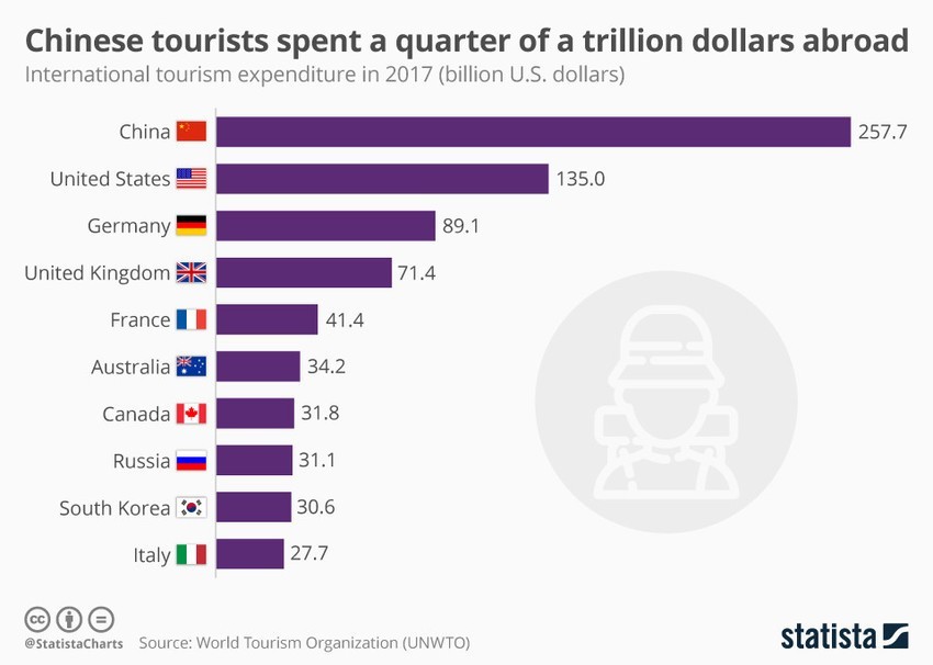 Η Κίνα διατηρεί την ηγετική της θέση στην παγκόσμια τουριστική αγορά από το 2012, με τους εξερχόμενους τουρίστες να ξοδεύουν το 2017 σχεδόν 258 δισεκατομμύρια δολάρια, περίπου το 20% των συνολικών δαπανών στον τουρισμό του κόσμου.