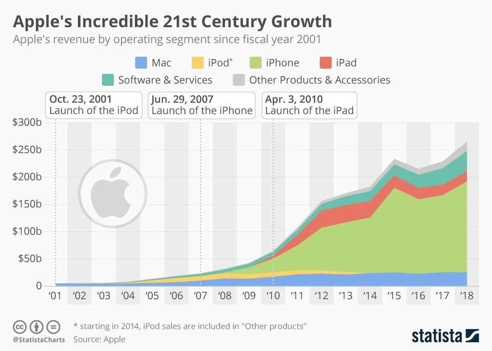 Ο παρακάτω πίνακας, που βασίζεται σε στοιχεία που προέρχονται από τις εκθέσεις της Apple, δείχνει την απίστευτη μεταμόρφωση που υπέστη η εταιρεία από τις αρχές του 21ου αιώνα. Το 2001, τα συνολικά έσοδα της Apple ανήλθαν σε 5,36 δισεκατομμύρια δολάρια, αλλά ήρθαν με απώλειες ύψους 25 εκατομμυρίων δολαρίων. Το οικονομικό έτος 2018, η Apple εμφάνισε καθαρά κέρδη 59,53 δισ. δολαρίων από έσοδα ύψους 265,60 δισ. δολαρίων.