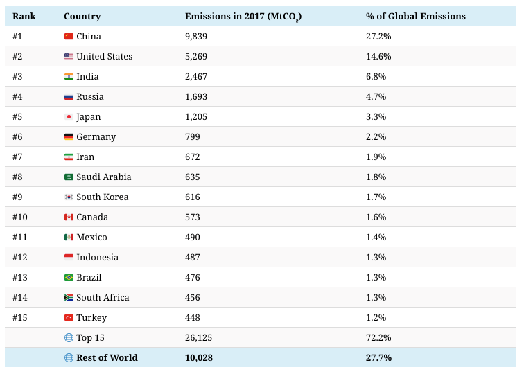 Υπάρχουν τεράστιες ανισότητες μεταξύ των κορυφαίων 15 χωρών που παράγουν εκπομπές CO2 στον κόσμο. Η Κίνα δημιουργεί σχεδόν διπλάσιες εκπομπές από τις ΗΠΑ που βρίσκονται στη δεύτερη θέση, που με τη σειρά τους είναι υπεύθυνες για περισσότερο από το διπλάσιο των επιπέδων της τρίτης Ινδίας.