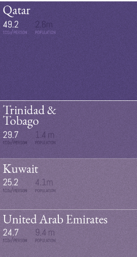 Εδώ, η Κίνα δεν είναι καν μέσα στις πρώτες 20. Το κατά κεφαλήν νούμερο 1 πηγαίνει στο Κατάρ, με τα κράτη του Κόλπου να κατέχουν 3 από τις 4 πρώτες θέσεις. Οι ΗΠΑ κατατάσσονται στην 8η θέση, πίσω από την Αυστραλία που είναι 7η.