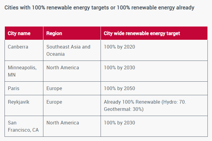 Μόνο το 7% των 596 πόλεων που βαθμολογήθηκαν από την CDP, έναν οργανισμό που βοηθά τις εταιρείες, τις πόλεις και τις χώρες να εντοπίσουν το περιβαλλοντικό τους αποτύπωμα, πέτυχαν βαθμολογία «Α» για τη μείωση των εκπομπών και τη θέσπιση σαφούς στρατηγικής. Ορισμένες από αυτές, συμπεριλαμβανομένης της Χάγης, της Βοστώνης και του Σίδνεϊ, στοχεύουν στο να είναι κλιματικά ουδέτερες ή χωρίς άνθρακα έως το 2050, ενώ πέντε έχουν στόχους για 100% ανανεώσιμη ενέργεια σε ολόκληρη την πόλη – το Ρέικιαβικ έχει ήδη φτάσει σε αυτό το όριο.