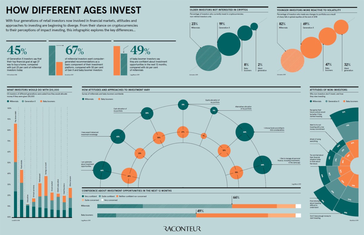 Το παραπάνω infographic είναι από την ιστοσελίδα Raconteur και παρουσιάζει μερικές από τις σημαντικότερες διαφορές στο πώς σκέφτονται οι γενιές σχετικά με τις επενδύσεις.