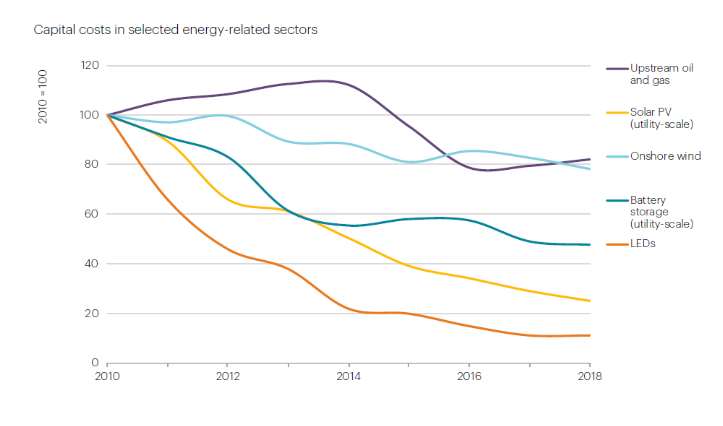Ορισμένες από τις πιο αξιοσημείωτες αλλαγές παρατηρήθηκαν στον τομέα της ηλεκτρικής ενέργειας, όπου σημειώθηκαν δραματικές μειώσεις στο κόστος της αποθήκευσης ηλιακής ενέργειας, αιολικής ενέργειας και μπαταριών.