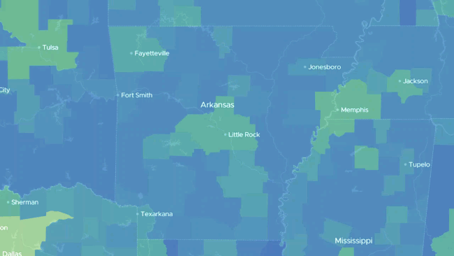 Η σχετικά δαπανηρή στέγαση διαπερνά τις ΗΠΑ σε περιοχές πολύ μακριά από τα αναμενόμενα αστικά κέντρα. Η κομητεία Πουλάσκι στο Αρκάνσας δε γίνεται ποτέ πιο προσιτή από πράσινη σε όλη την απεικόνιση, για παράδειγμα. Αν και το Αρκάνσας έχει τη φθηνότερη στέγαση από οποιαδήποτε πολιτεία των ΗΠΑ, σύμφωνα με το NLIHC, ένα άτομο πρέπει να εργάζεται 65 ώρες την εβδομάδα με τον ελάχιστο μισθό για να αντέξει ένα δίκλινο υπνοδωμάτιο με βάση τις τιμές της αγοράς.