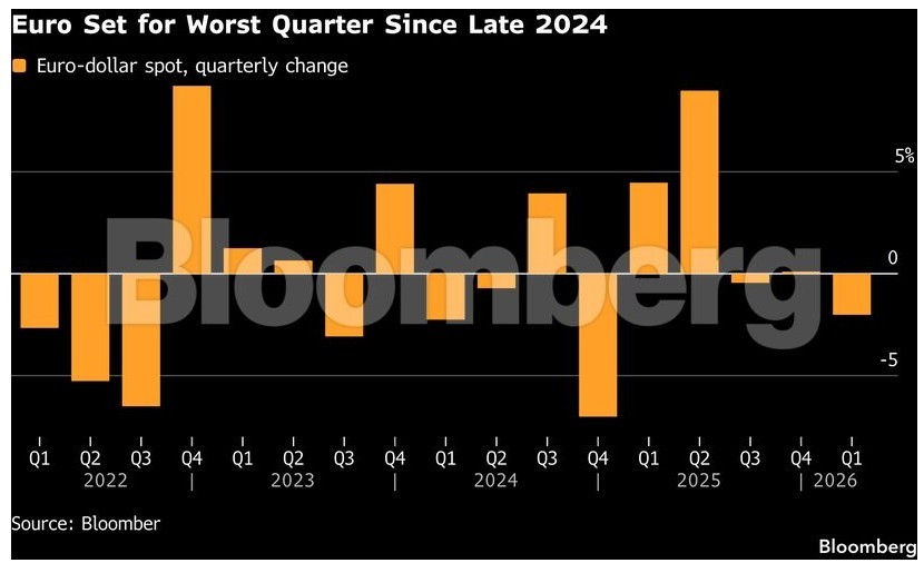 Προς το χειρότερο τρίμηνό του από το 2024 οδεύει το ευρώ, καθώς ο πόλεμος στη Μέση Ανατολή υπογραμμίζει την εξάρτηση της Ευρώπης από τις εισαγωγές ενέργειας, γεγονός που κλονίζει τις οικονομικές προοπτικές.