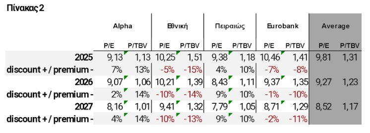 Θα αναφερθούμε σε ορισμένα βασικά και ποιοτικά στοιχεία του κλάδου και θα εξετάσουμε το 2026 και 2027 χρησιμοποιώντας δύο γνωστούς αλλά βασικούς αριθμοδείκτες, την τιμή προς καθαρά κέρδη (P/E) και την τιμή προς τα ενσώματα ίδια κεφάλαια (P/TBV). Όπως και στο παρελθόν, καταγράφουμε τα ενσώματα ίδια κεφάλαια, τα οποία προκύπτουν από το σύνολο των ιδίων κεφαλαίων μείον τα άυλα περιουσιακά στοιχεία. Έτσι, η ΑΛΦΑ εμφανίζεται με €7,59 δις, η Πειραιώς με €8,48δις, η Εθνική με €8.34 δις και η Eurobank με €10,11δις (Πίνακας 1). Επίσης, τα παραπάνω κεφάλαια υποστηρίζουν ενεργητικό αξίας €77,46δις, €90,09δις, €78,89δις και €107,98δισ αντίστοιχα (Πίνακας 1). Ήτοι, την χαμηλότερη μόχλευση (ενεργητικό/ενσώματα ίδια κεφάλαια) την εμφανίζει η Εθνική με αναλογία 9,45 και την υψηλότερη η Eurobank και η Πειραιώς με αναλογία 10,6. Προχωράμε εξετάζοντας τα βασικά στοιχεία ενεργητικού που παράγουν τόκο (interest bearing assets), όπως τα δάνεια (μετά από προβλέψεις) και το επενδυτικό χαρτοφυλάκιο των τραπεζών. Εδώ παρατηρούμε ότι όλες οι τράπεζες διαθέτουν περί τα €61,5δις (±0,5δις) στοιχείων που παράγουν τόκο πλην της Eurobank, η οποία διαθέτει 79,6δισ. Επίσης, σημειώνουμε ότι όλες πρόσθεσαν πάνω από €3δις σε δάνεια μετά από προβλέψεις σε σχέση με το 2024 (πιστωτική επέκταση), ενώ και το επενδυτικό τους χαρτοφυλάκιο αυξήθηκε κατά 10% περίπου πλην της ΑΛΦΑ, της οποίας παρέμεινε στα ίδια περίπου επίπεδα σε σχέση με το 2024. Τα υψηλότερα επιτοκιακά περιθώρια απολαμβάνει η Εθνική με 2,8% ενώ τα χαμηλότερα περιθώρια εμφανίζει η ΑΛΦΑ με 2,2%. Σύμφωνα και με τα παραπάνω, τα υψηλότερα οργανικά έσοδα, ήτοι τα καθαρά έσοδα από τόκους συν τα καθαρά έσοδα από αμοιβές και προμήθειες εμφανίζει η Eurobank στα €2,06δις, ενώ η ΑΛΦΑ εμφανίζει τα χαμηλότερα στα €1,3δις.