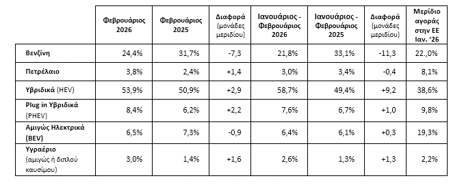 Όσον αφορά στα ηλεκτρικά η αγορά του διμήνου τρέχει με2,8% άνοδο, έχουν ταξινομηθεί 1289 οχήματα. Τώρα όσον αφορά στο καύσιμο η ελεύθερη πτώση της βενζίνης συνεχίζεται καθώς μόλις 1 στους 4 πλέον αγοράζει τέτοιο όχημα. Το 69% επιλέγει οχήματα εξηλεκτρισμένα με έναν τουλάχιστο ηλεκτροκινητήρα, μικρό ή μεγάλο.