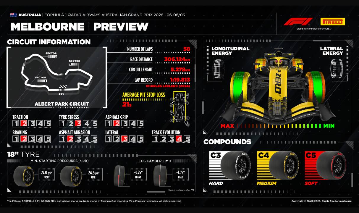 Η σχεδίασή της δεν θέτει ιδιαίτερα υψηλές απαιτήσεις στα ελαστικά, με τη φθορά να έρχεται συνήθως από τη χρήση παρά από θερμικούς παράγοντες. Η άσφαλτος, η οποία αποτελείται εν μέρει από δημόσιους δρόμους ανοιχτούς στην κυκλοφορία, είναι πολύ λεία. Από τις πρώτες κιόλας περιόδους ελεύθερων δοκιμών, θα έχει ενδιαφέρον να δούμε πώς θα επιλέξουν οι ομάδες να προσεγγίσουν το τριήμερο, όπου θα αποκαλύψουν πλήρως τις δυνατότητες των μονοθεσίων τους. Οι αρχικές περίοδοι στην πίστα θα χρησιμεύσουν πιθανότατα και για τη μελέτη του τρόπου με τον οποίο μπορεί να εξισορροπηθεί καλύτερα η θερμοκρασία μεταξύ των δύο αξόνων. Η ενέργεια που παρέχεται από την υβριδική μηχανή στον πίσω άξονα θα δημιουργήσει αναπόφευκτα μια ασυμμετρία που μπορεί να χρειαστεί να διορθωθεί, ιδιαίτερα στις κατατακτήριες δοκιμές, είτε διαφοροποιώντας τις θερμοκρασίες στις κουβέρτες των ελαστικών είτε ολοκληρώνοντας έναν γύρο προθέρμανσης πριν από τον γρήγορο γύρο. Όσον αφορά στις στρατηγικές του αγώνα, πρέπει να ληφθούν υπόψη τουλάχιστον δύο μεταβλητές. Η πρώτη αφορά τα αεροδυναμικά φορτία που παράγονται από το κάθε μονοθέσιο, τα οποία θα μπορούσαν να αποδειχθούν καθοριστικά για το αν θα χρησιμοποιηθεί ή όχι η μαλακότερη γόμα κατά τη διάρκεια ενός μέρος αγώνα, κάτι που θεωρητικά αποτελεί επιλογή σε μια πίστα σχετικά χαμηλής καταπόνησης όπως αυτή της Μελβούρνης.
