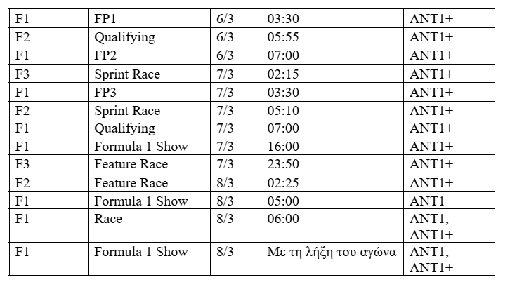 Την Κυριακή 8 Μαρτίου η εκπομπή «Formula 1 Show» θα ξεκινήσει στις 05:00 σε ΑΝΤ1 και ΑΝΤ1+, ενώ μετά τη λήξη του αγώνα θα ακολουθήσει Post Race ως τις 08:45, με την ανάλυση του αγώνα. Στην παρουσίαση και στις μεταδόσεις θα βρίσκονται οι Τάκης Πουρναράκης, Πάνος Σεϊτανίδης, Μαρία Θωμά, Κώστας Λεώνης, Μαρία Ανδρεάδη και Γιώργος Ανανίδας, ενώ ο Τζώρτζης Μαρκογιάννης θα σχολιάζει από τη θέση του οδηγού.