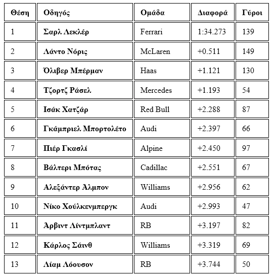 Ο Μονεγάσκος οδηγός, εκμεταλλευόμενος την αυξημένη αξιοπιστία της SF-26, κατάφερε να σταματήσει το χρονόμετρο στο 1:34.273, αφήνοντας πίσω του, τον παγκόσμιο πρωταθλητή Λάντο Νόρις και την έκπληξη της ημέρας, τον Όλιβερ Μπέαρμαν. Η ημέρα χαρακτηρίστηκε από τις προκλήσεις των νέων κανονισμών, με τις ομάδες να προσπαθούν να ξεκλειδώσουν τα μυστικά των νέων αεροδυναμικών πακέτων και της υβριδικής μηχανής που πλέον διαθέτει πολύ μεγαλύτερη ηλεκτρική ισχύ. Ο Λεκλέρ ήταν ο απόλυτος πρωταγωνιστής της πρωινής και της απογευματινής δράσης, δείχνοντας ότι η Ferrari έχει κάνει σημαντικά βήματα προόδου στη διαχείριση της ενέργειας. Με 62 γύρους στο ενεργητικό του το πρωί και συνολικά πάνω από 135 μέχρι το τέλος της ημέρας, ο Μονεγάσκος εστίασε σε προσομοιώσεις αγώνα και σε δοκιμές διαφορετικών χαρτογραφήσεων της υβριδικής μηχανής. Η σταθερότητα των χρόνων του ήταν το στοιχείο που εντυπωσίασε περισσότερο, καθώς η Ferrari δεν έδειξε σημάδια έντονης φθοράς των ελαστικών, ένα πρόβλημα που την ταλαιπώρησε στο παρελθόν.