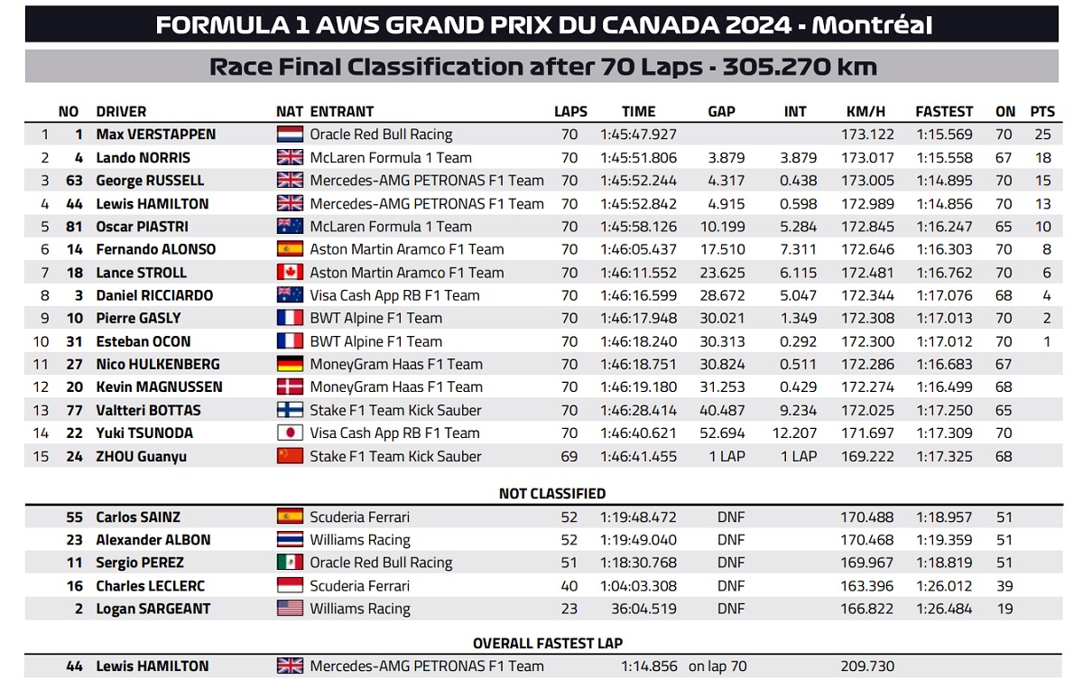 Αυτή ήταν η 60η νίκη του Μαξ στη Formula 1, η τρίτη συνεχόμενη στο Μόντρεαλ και η έκτη της σεζόν. Είναι η 119η νίκη της Red Bull, η πέμπτη σε αυτό το Grand Prix.