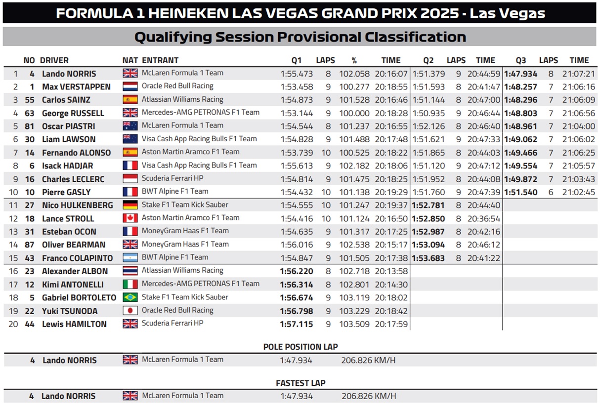 «Σε κάθε στροφή είχες την αίσθηση ότι θα τρακάρεις» τόνισε ο poleman Λάντο Νόρις, που θα εκκινήσει αύριο έχοντας δίπλα του τον πρωταθλητή Μαξ Φερστάπεν. O έτερος διεκδικητής του τίτλου Όσκαρ Πιάστρι είχε δυσκολίες, δεν μπόρεσε να βρει ρυθμό και περιορίστηκε στην 5η θέση της κατάταξης. Ανάμεσα στους 3 διεκδικητές του τίτλου βρίσκονται οι Σάινθ και Ράσελ με τον Ισπανό να εντυπωσιάζει με την ταχύτητά του.