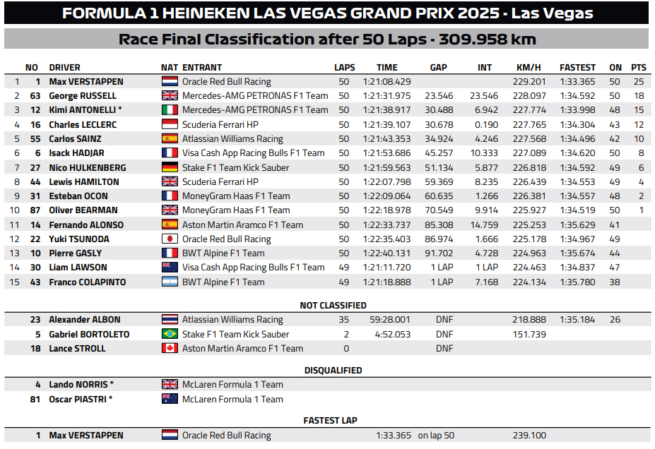 Ο Φερστάπεν κέρδισε για δεύτερη φορά στο Λας Βέγκας (η πρώτη ήταν το 2023). Πρόκειται για μια νίκη καθοριστική για την μάχη του τίτλου καθώς απομένουν 58 βαθμοί να μοιραστούν σε δυο αγώνες και ένα Sprint τις δυο ερχόμενες Κυριακές. Οι ΜcLaren αποκλείστηκαν γιατί είχαν φθορά εκτός ορίων στο πάτωμα.
