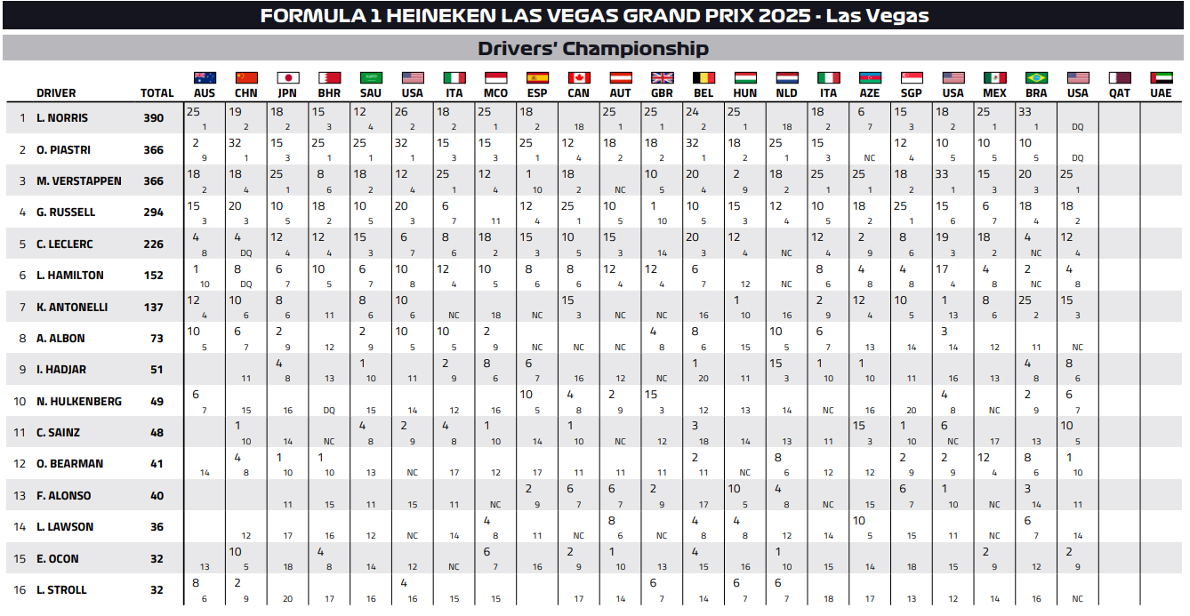 Επόμενος και προτελευταίος αγώνας της χρονιάς την ερχόμενη Κυριακή 30/11 στο Κατάρ. Εκεί θα έχουμε και το τελευταίο Sprint της χρονιάς. Η τελική κατάταξη και οι βαθμολογίες άλλαξαν μετά τον αποκλεισμό των McLaren.